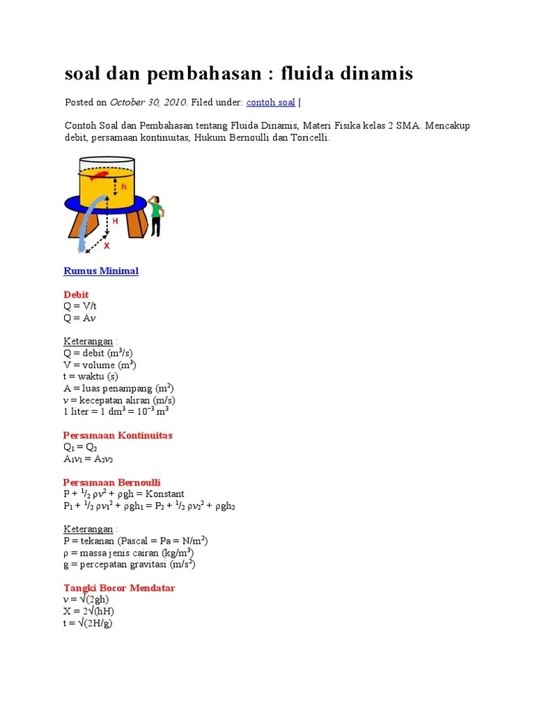 Contoh soal dan pembahasan tentang fluida dinamis materi fisika kelas 2 smamencakup debit persamaan kontinuitas hukum bernoulli dan toricelli dan gaya angkat . Soal fluida statis adalah kumpulan beberapa soal yang menyangkut konsep dasar dari fluida statis. Contoh soal dan pembahasan fluida statis. Rangkuman materi bab fluida statis kelas xi/11 disertai contoh soal dan jawaban dengan pembahasan lengkapnya ayo masuk kesini. Rangkuman materi bab fluida statis kelas xi 11 disertai contoh soal dan jawaban dengan pembahasan lengkapnya ayo masuk kesini.